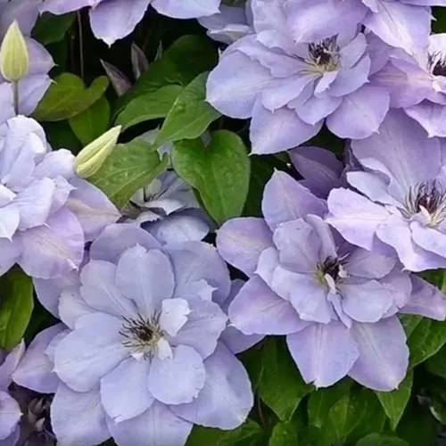 Цветы этого сорта крупные с диаметром до 22 см. Они представлены элегантной формой с 8-25 эллиптическими заостренными лепестками. Махровость цветков полумахровая, добавляющая дополнительный объем и текстуру в композицию. Выделяются фиолетовые тычинки, которые гармонично сочетаются со светло-голубым фоном лепестков. Цветение начинается в мае и продолжается до июля, с повторным цветением в сентябре, что позволяет наслаждаться его красотой на протяжении всего теплого сезона.