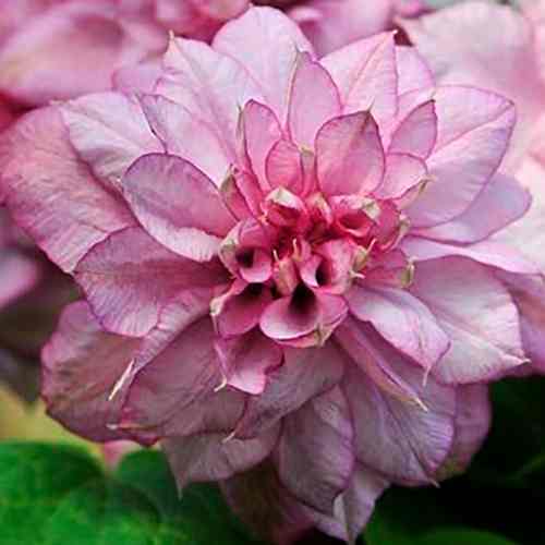 Сорт Инносент Гланс выпускает крупные махровые цветки размером 14 — 15 см. Лепестки растения светло-розовые, на заостренных кончиках – сиреневой окраски. Количество лепестков в одном цветке — 40 — 60. Тычинки у цветка на белых нитях с желтыми пыльниками.