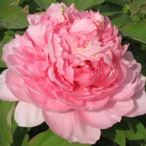 Период цветения приходится на конец мая — начало июня и длится 2–3 недели. Диаметр цветка составляет 16–20 см. Лепестки многорядные, широкие и слегка волнистые, формируют плотный и воздушный бутон. Окрас — нежно-розовый с перламутровым блеском, центр более насыщенного розового оттенка, что создаёт глубину и выразительность. Аромат лёгкий и сладковатый, приятный и ненавязчивый.
